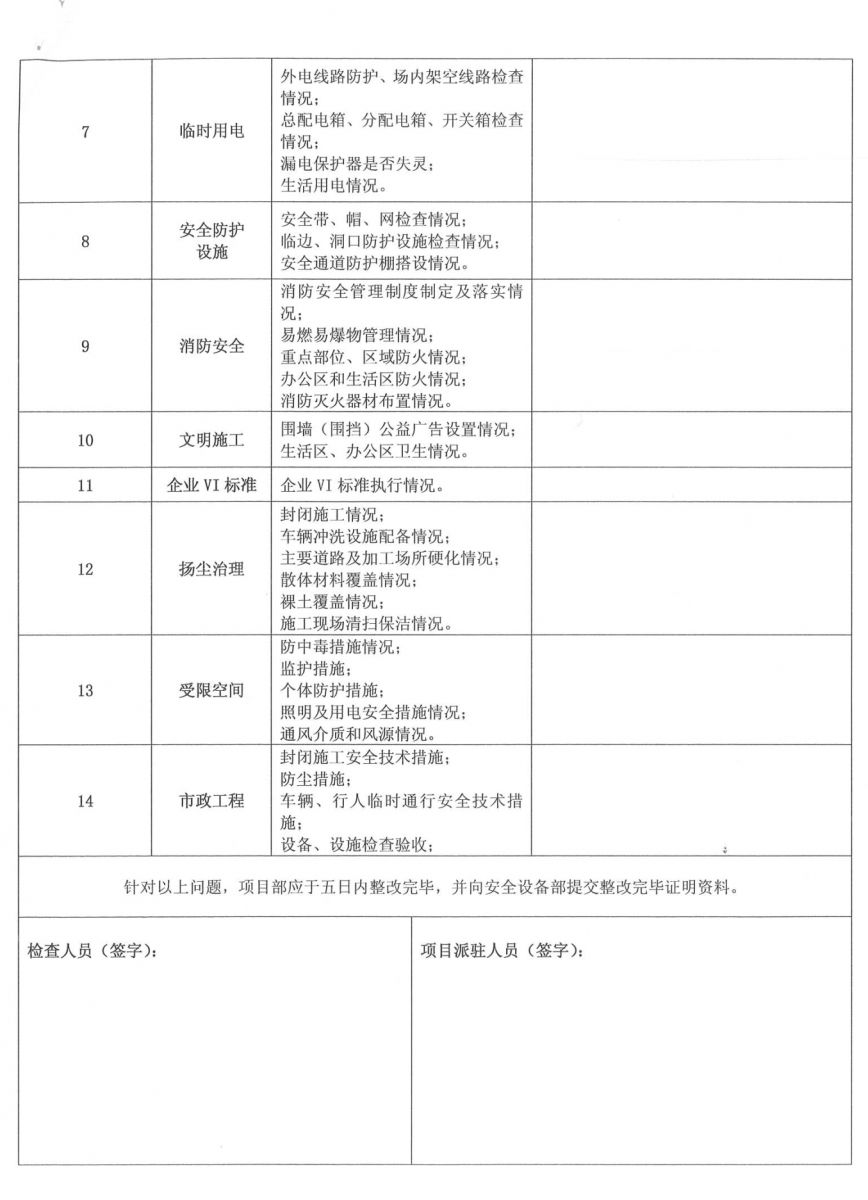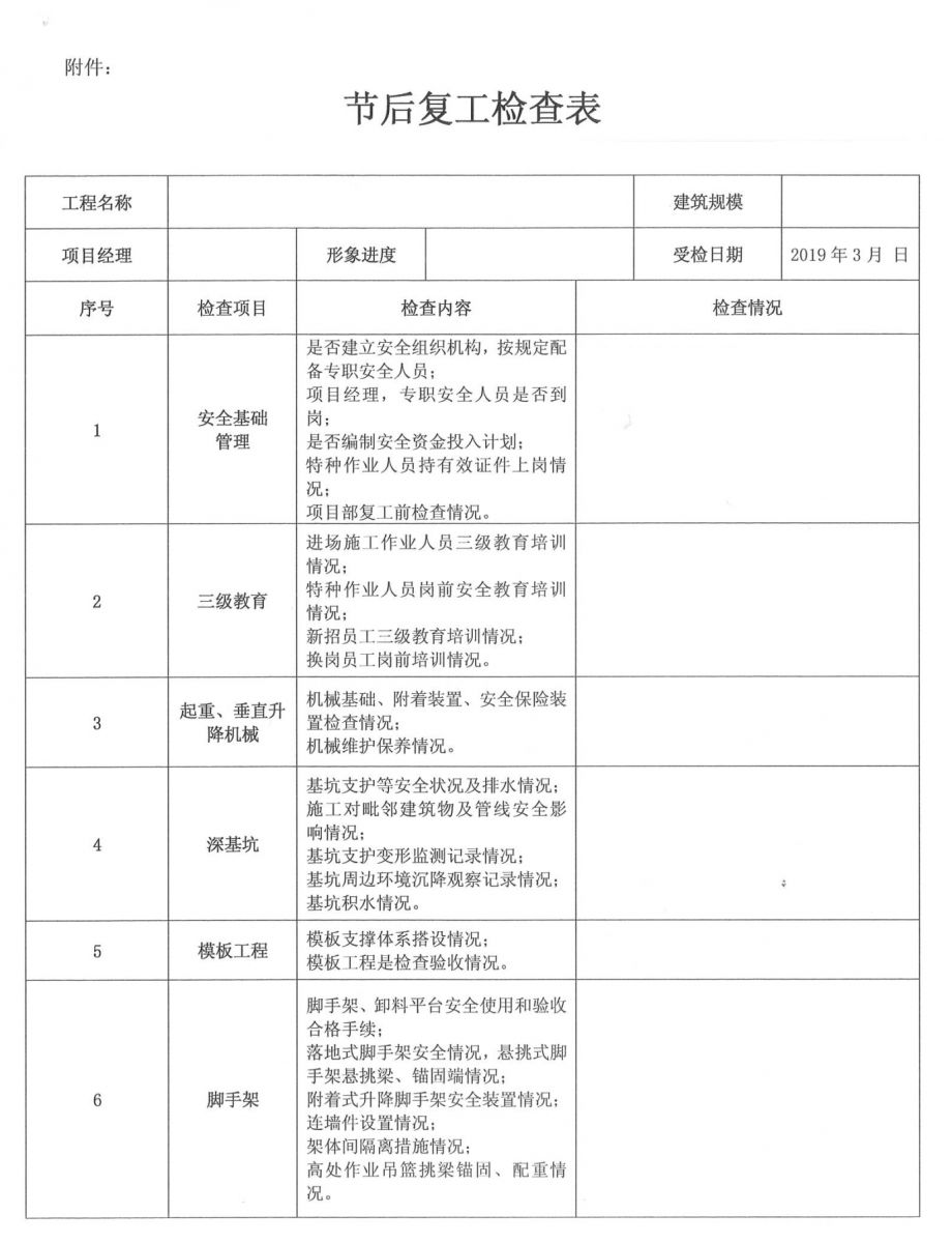 皖廣建字[2019]06號 集團公司各部室、子公司、項目部: 春節(jié)假期已經(jīng)結束,各項目已陸續(xù)進入復工階段。為進一步落實“四個意識”,提升“四種能力”建設,鞏固增強施工現(xiàn)場安全、質量及揚塵防治的管理工作,加快推進現(xiàn)場標準化進程,查隱患、排險情,確保當前安全生產形勢起步穩(wěn)定,為全年生產管理工作開好頭,公司決定對各在建項目開展節(jié)后復工暨春季施工安全、質量及揚塵防治大檢查,現(xiàn)將有關事宜通知如下: 一、檢查時間 2019年3月1日——2019年3月12日 二、檢查組成員 組 長:張 濤 副組長:張亞偉 組 員:王 軍、藺 濤、方 路、李芬芬 三、檢查內容 1、項目部復工工作 (1)項目部在接到通知后應高度重視,通過開會議、抓培訓、搞宣傳等方式方法,廣泛深入開展節(jié)后復工動員部署工作,為生產活動的展開創(chuàng)造一個穩(wěn)定的環(huán)境。 (2)項目關鍵崗位人員必須全部到位履職,履行相關職責,并嚴格按照規(guī)定進行考勤。 (3)立即開展現(xiàn)場自查自糾工作,要杜絕盲目樂觀情緒和松懈麻痹思想,對自查過程中發(fā)現(xiàn)的問題要書面記錄并及時整改,整改情況書面記錄存檔備查。 (4)各項目在復工前應對現(xiàn)場所有進場施工作業(yè)人員、新上崗人員、轉崗人員認真落實“三級”安全教育培訓,對其他返崗人員尤其是特種作業(yè)人員按規(guī)定進行崗前再教育、再培訓,務必使每位員工具備必要的安全生產知識,熟悉崗位安全生產操作規(guī)程,掌握安全生產基本技能; (5)開展復工前的安全教育培訓,要對作業(yè)人員進行登記造冊,未經(jīng)安全教育培訓的工人,不得上崗作業(yè)。復工前的安全教育培訓必須簽字齊全并記錄、留存。 2、安全生產、文明施工、揚塵防治檢查 (1)危險性較大的分部分項工程及深基坑、高支模、腳手架等超過一定規(guī)模的危險性較大的分部分項工程方案編制、審批及專家論證、方案的落實情況; (2)塔吊、施工升降機等施工機械備案情況,施工機械復工前檢查記錄,垂直運輸機械全過程安全監(jiān)控,施工機械設備檢查、保養(yǎng)、維修臺賬; (3)臨邊洞口、高處作業(yè)、臨時用電、模板支架、腳手架、地下室安全設施、消防裝置是否按相關規(guī)定布置落實,防高墜專項方案的編制、審批和落實情況; (4)按照建設行政主管部門的文件要求,落實各項揚塵防治措施的情況; (5)企業(yè)VI標準的執(zhí)行及崗位責任制的落實情況; (6)作業(yè)人員安全技術交底、特種作業(yè)人員執(zhí)證上崗及崗前教育情況,安全資料的同步收集整理及存檔情況。 (7)安全標準化工地的創(chuàng)建情況。 3、質量管理 (1)施工現(xiàn)場工程質量管理體系、管理制度的落實情況; (2)強制性標準執(zhí)行情況; (3)質量標準化建設執(zhí)行情況; (4)現(xiàn)場原材料取樣檢測及工程資料收集整理情況。 (5)質量精品工程的創(chuàng)建情況。 各項目部接到通知后必須統(tǒng)一思想、提高認識、落實責任,按各級建設行政主管部門及集團公司的要求做好各項復工前準備工作,認真落實安全生產、質量管理、揚塵防治工作。公司將嚴格按照文件要求對在建項目進行全面檢查,對現(xiàn)場自查不力、查而不糾、被動應付的項目,公司按《項目安全生產責任書》嚴厲處罰。 二〇一九年二月二十日 附:節(jié)后復工檢查表